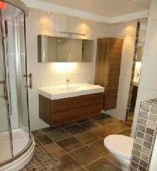 Her har vi fjernet vegg mot bod, det innebærer å pigge ut eksisterende betonggulv for å flytte røropplegg/sluk, nye varmekabler og nytt betonggulv. Dør fra gammel bod fjernes og vi setter inn ett vindu av glassbyggerstein. Vi lager ny døråpning fra soverom til badet. Det nye gjestetoalettet bruker eksisterende baderomsinngang. Begge badene får vegghengte wc'er........